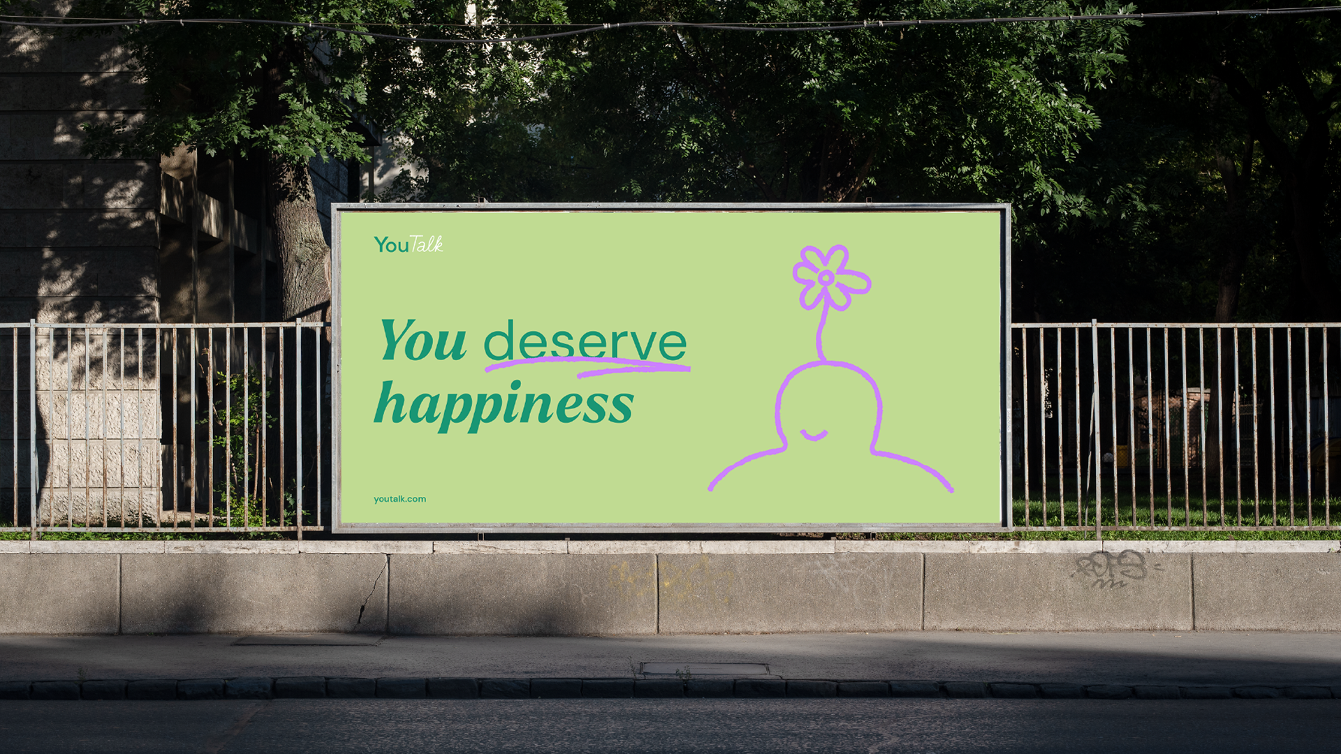 Delving into the concept of the YouTalk branding project for a mental health center was more than just creating visuals; it was about crafting an experience. The character illustration, depicting a range of emotions, became relatable companions for the community, embodying their diverse experiences. Paired with the tagline "You deserve...", the branding promises support, validation, and empowerment for every individual. Together, these elements form a narrative of empathy and belonging, making YouTalk a lifeline for those seeking connection and understanding.